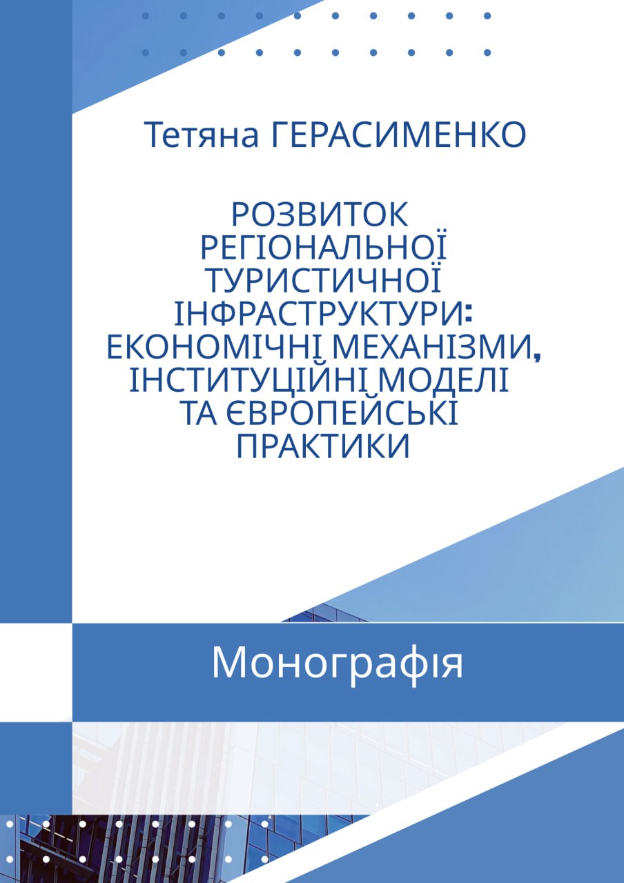 Герасименко Т.В. Розвиток регіональної туристичної інфраструктури: економічні механізми, інституціональні моделі та європейські практики: монографія / Т.В. Герасименко; М-во освіти і науки України, Нац. техн. ун-т «Дніпровська політехніка». Дніпро : Герда, 2025. 312 с. Посилання |  | |